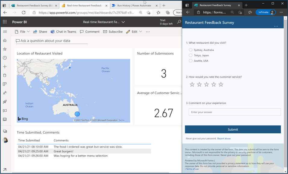 This activity will take you through how you can build a real-time dashboard in Power BI. With help from Power Automate, you can see the changes in Power BI occur before your eyes, by creating a push dataset. This activity will demonstrate a scenario using Microsoft Forms. You can use the tools to collect survey responses, send it to Power BI, and view the feedback immediately in your dashboard.