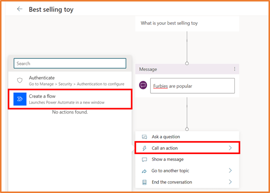 Go to Power Virtual Agents. In your topic, add a Call an action node. Create a new flow.