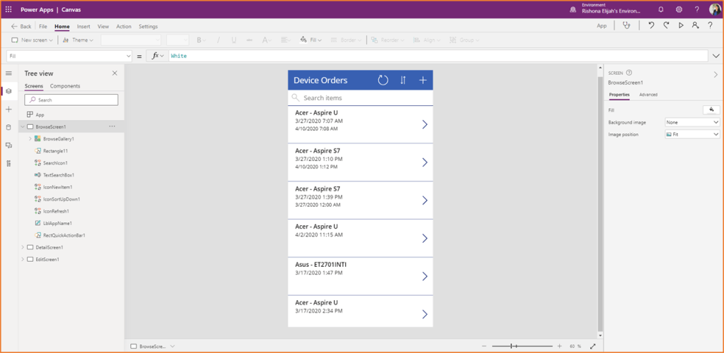 - Browse Screen with a gallery displaying the records from your data source. There is already a search bar, ability to sort records and add new records.
