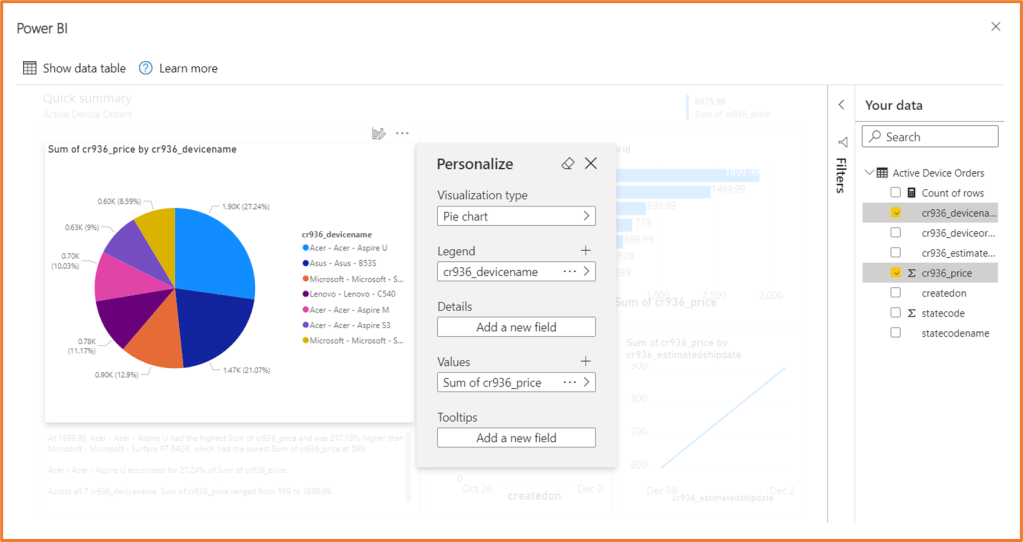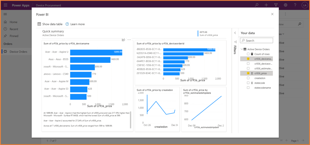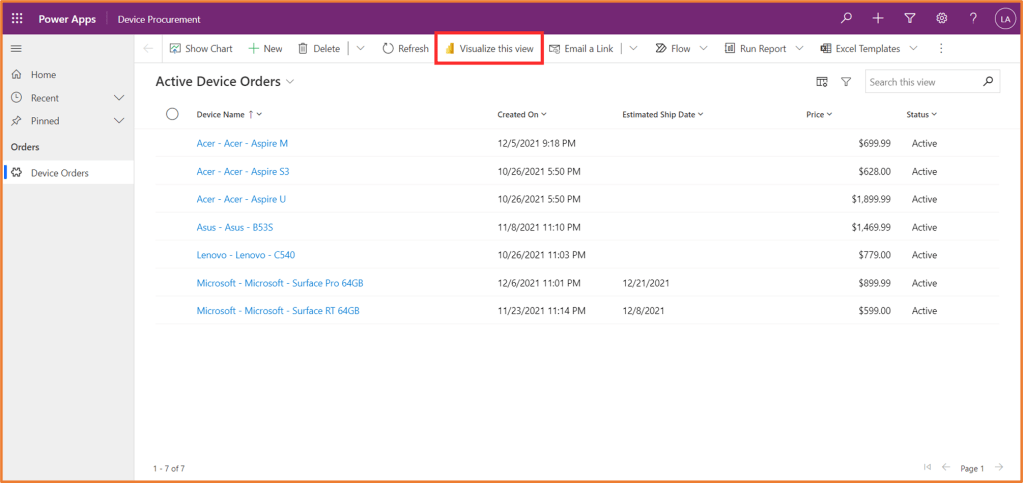 In your model-driven apps, it is now possible to get an auto-generated Power BI report based on your Dataverse data. From a view in your app, you can simply click the Visualize this view button to see the generated Power BI report.