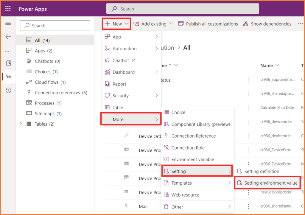 To enable this capability, you will need to activate the setting. To do this, open the solution for your app in Power Apps. Select New (or Add existing) > More > Setting > Setting environment variable.