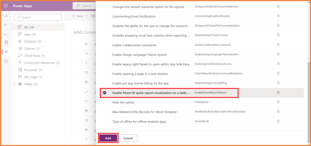 Add the Enable Power BI Quick Report setting.