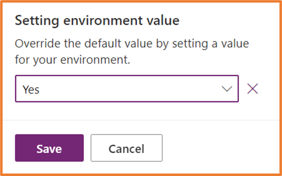 Select Yes for your Setting environment value and publish customisations. You should see the button now when you open a view in your model driven app.