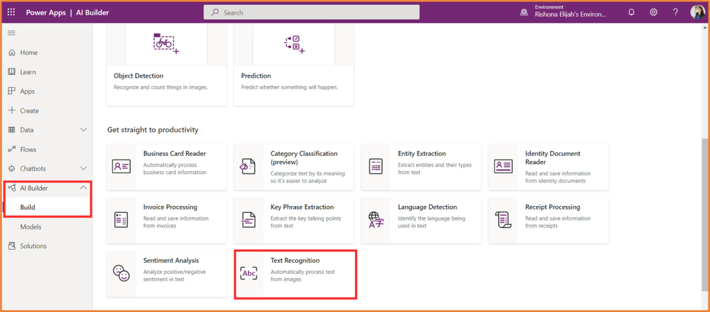 You will need AI Builder. If you don’t have a subscription for it, you can still try it out for free using the Power Apps Developer Plan. Go to https://make.powerapps.com/ and select AI Builder > Build from the left navigation menu. Click on the Text Recognition model.