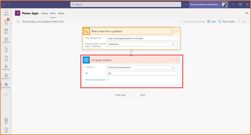 Your action after the trigger should be from the Office 365 Groups connector: List group members. For the Group ID, select the Microsoft Team where your bot users would be in. This doesn’t need to be the same Team you created your bot in. However, you will need to be an admin of the Team. You can type 999 in the Top field. This is the max number of users it can look for.