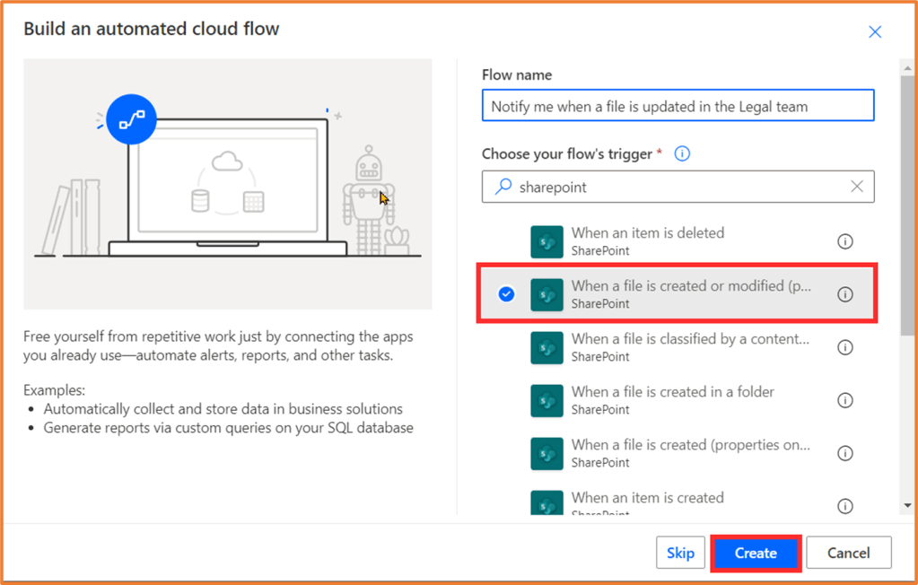 Give your flow a name and search for SharePoint as the trigger. Select the SharePoint trigger When a file is created or modified. Click Create.
