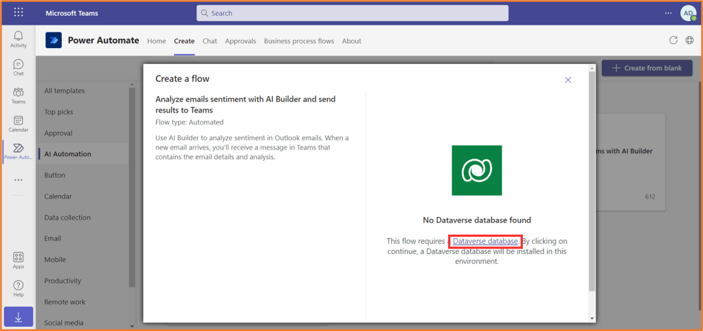 When you click on one of the templates, you may be prompted to install a Dataverse database first (this is necessary in order to use AI Builder).