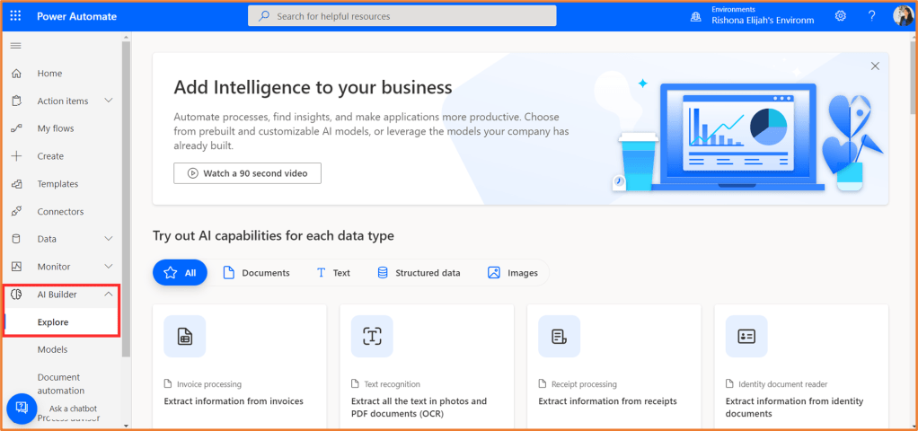 Head to https://flow.microsoft.com/ and sign in with your work email address. If you want to try out AI Builder for free, you can use the free Power Apps developer environment- see here on how to sign up. Once you’re in, head over to AI Builder > Explore from the navigation menu to get started with using the prebuild AI models, or train your own custom one.