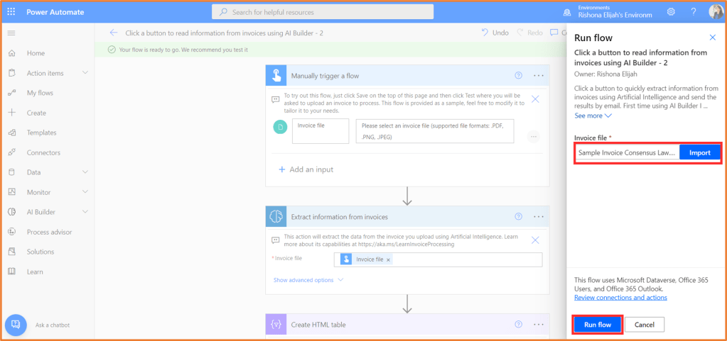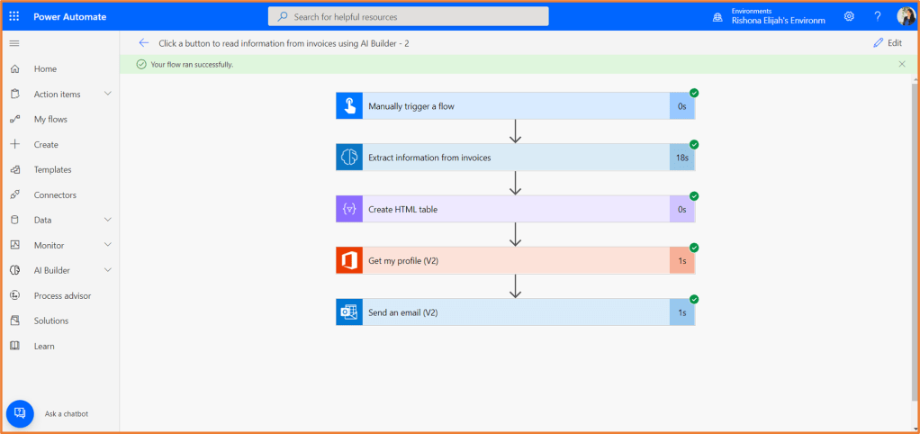 If you want to see all the values that were extracted from your invoice, click on the action Extract information from invoices from the successful flow run. You will see a list of the outputs and their confidence score here.