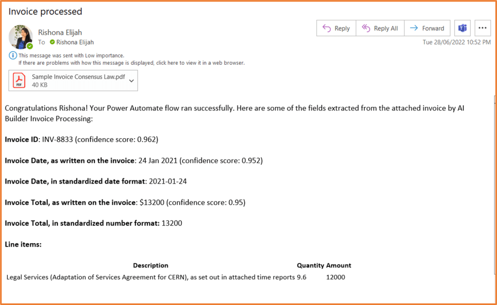 By default, the flow you see here will send you an email with the extracted Invoice ID, Invoice date, Invoice total and line items. To see more values, you can select the field from the Dynamic content list and insert it throughout the email action.