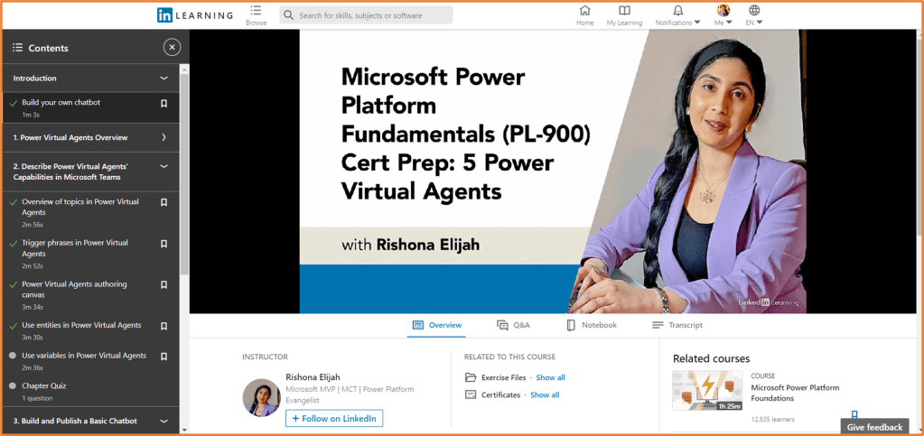 Happy to announce that my LinkedIn Learning course on Power Virtual Agents is available now! This is an introductory course (no prior knowledge or experience needed) that will take you through what you need to get started building your own chatbots with Microsoft’s no-code tool, Power Virtual Agents (PVA). With PVA, within minutes you can build a bot to use in Microsoft Teams- such as a bot that can answer your colleague’s HR questions, or submit their IT helpdesk requests.