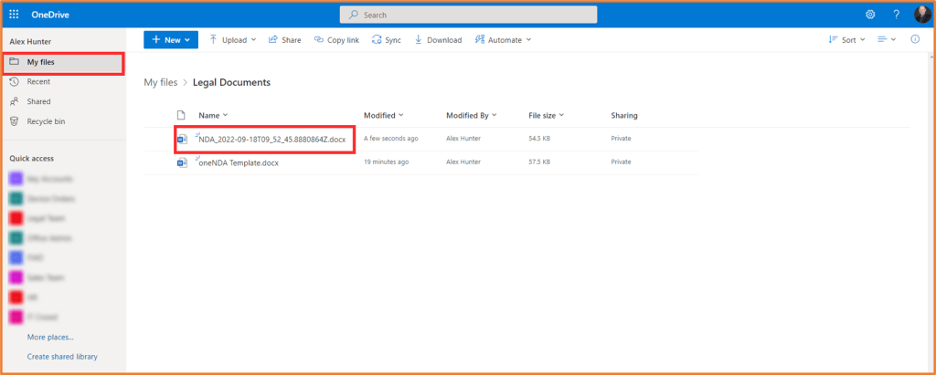 Screenshot of document generated and stored in OneDrive
