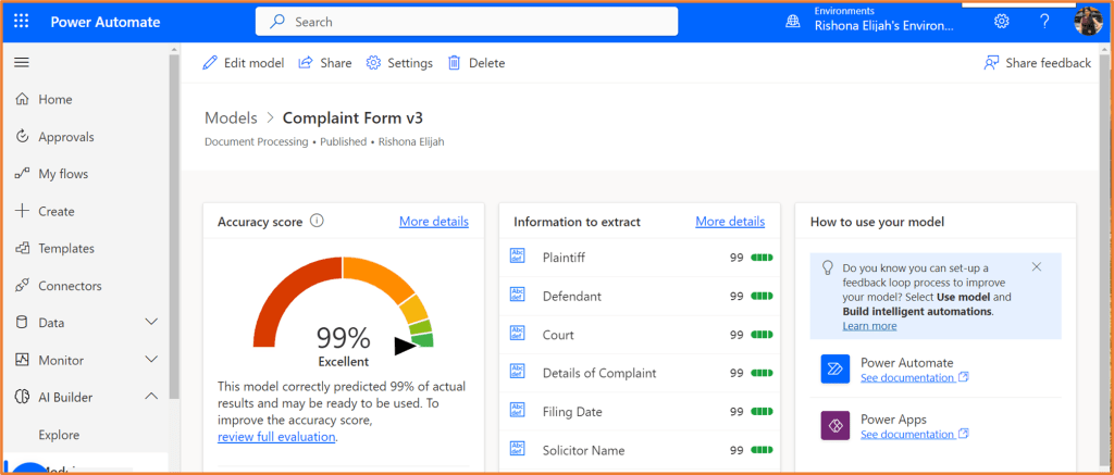 If you’re using AI Builder to read your custom documents, process text or detect objects, you may have encountered occasions where you receive a low accuracy (confidence) score for predictions. With the upcoming feedback loop feature, low-scored documents will be flagged and sent back to the training wizard queue for retraining. The maker can view these, then retrain the model to account for the new documents. This helps to maintain the quality of the AI model over time.