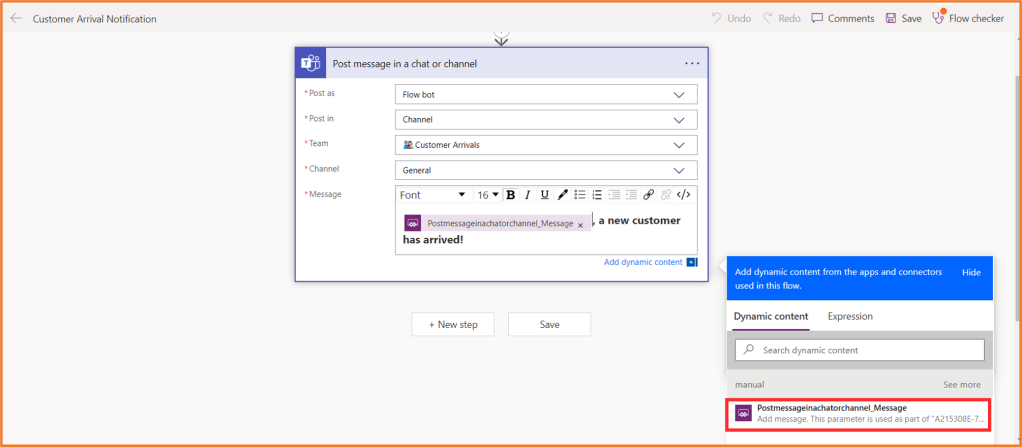 Upon a customer entering their name and clicking Submit, the flow will run and post the message in a Teams channel to notify staff.