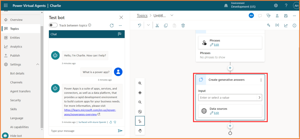 Here, I’ve added the link for Microsoft Learn, which contains all the documentation for Microsoft products. If I ask my bot “What is a Power App?” it will search Microsoft Learn and provide a response.