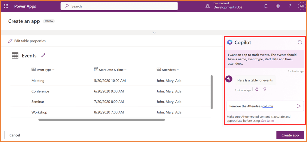 It will then create a Dataverse table with the columns I mentioned or anything else that might be relevant, set a suitable data type for the columns and generate sample data. You have the option to manually make any changes to the table, or you can use the copilot chat to describe your changes. In this case, I’m not happy with the Attendees column it added. I can tell copilot to remove it, and the changes will be applied.