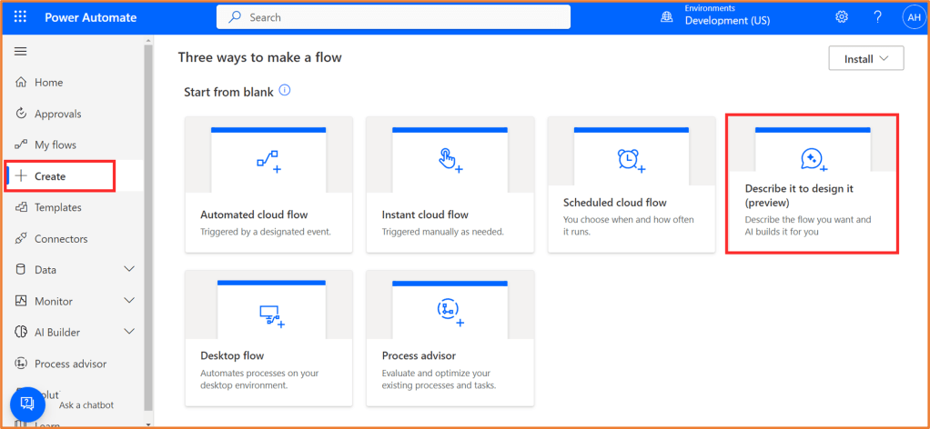 To try it out, head to the Create area, and select Describe it to design it (preview).