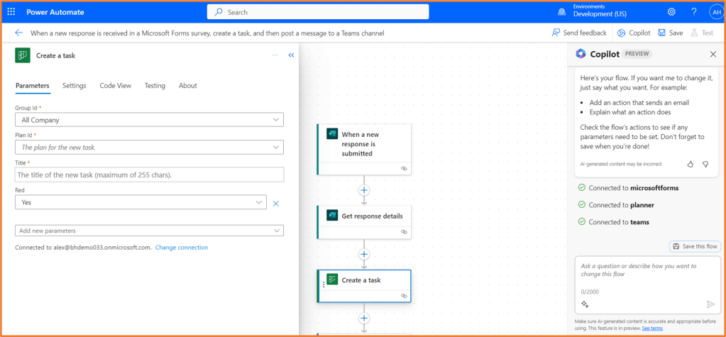 With this feature, you can build out a flow by describing it. For example, if I say “When a new response is received in a Microsoft Forms survey, create a task, and then post a message to a Teams channel” it will provide me with a suggested flow.