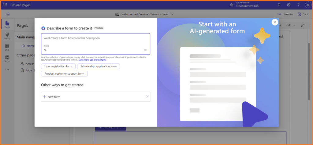 To try it out, go to the Topics area of PVA and click +New topic > Create with Copilot.