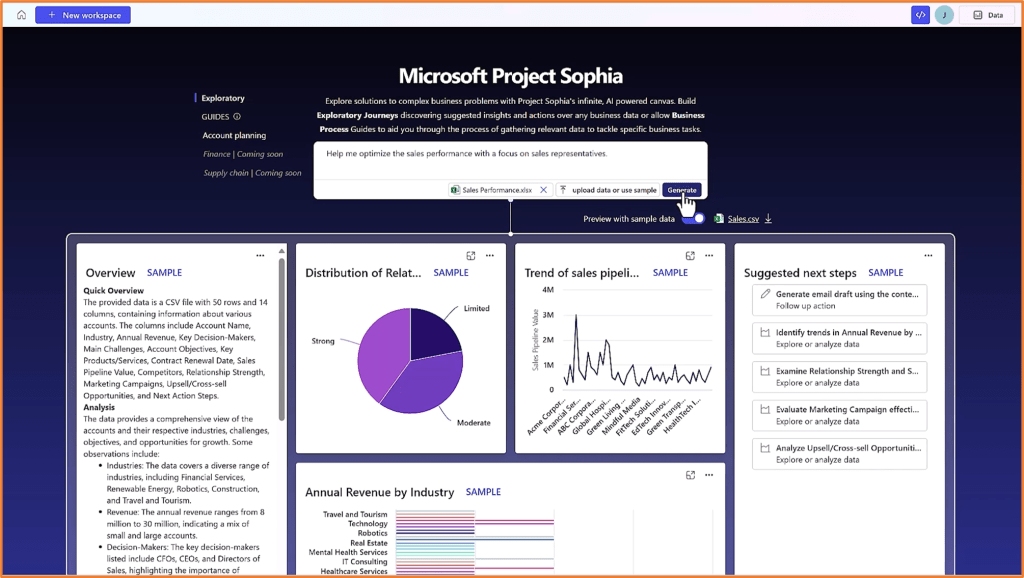 Project “Sophia” was revealed last week at Microsoft Ignite. With Project Sophia, you can create exploratory journeys and get AI-generated charts and insights from your business data without any manual work.