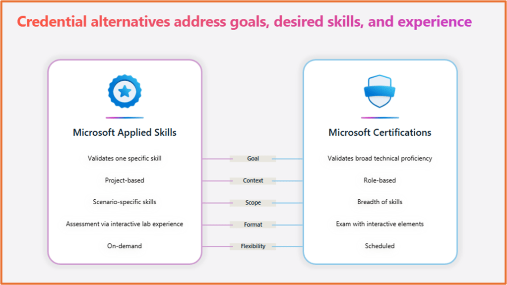- To earn a certification, an individual must pass a proctored, scheduled exam that has interactive elements; and to earn an Applied Skills credential, an individual must pass an on-demand, lab-based assessment, using the actual technology to complete the tasks.