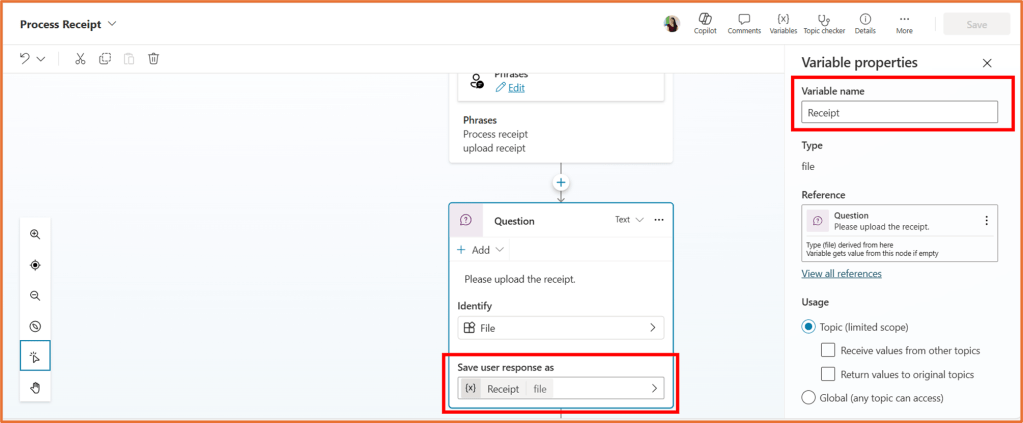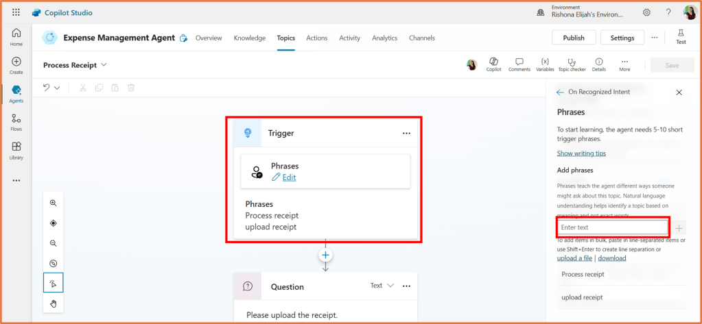 Begin a new topic for your agent in Copilot Studio. You can add trigger phrases, such as “process receipt” or “upload receipt”.