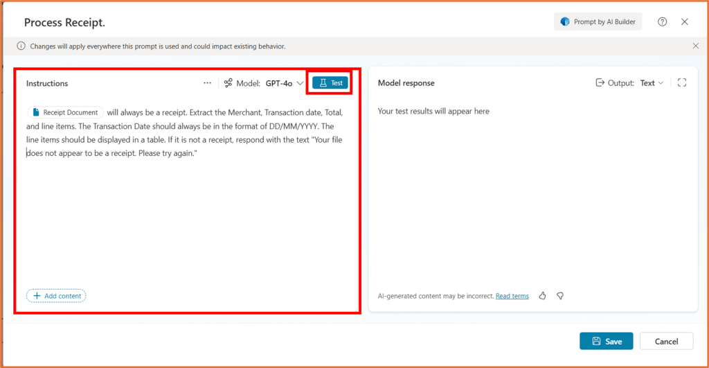 You can modify the prompt to achieve your desired output. You can click on Receipt Document and upload a file to test the prompt on a different receipt. Then, click Save.