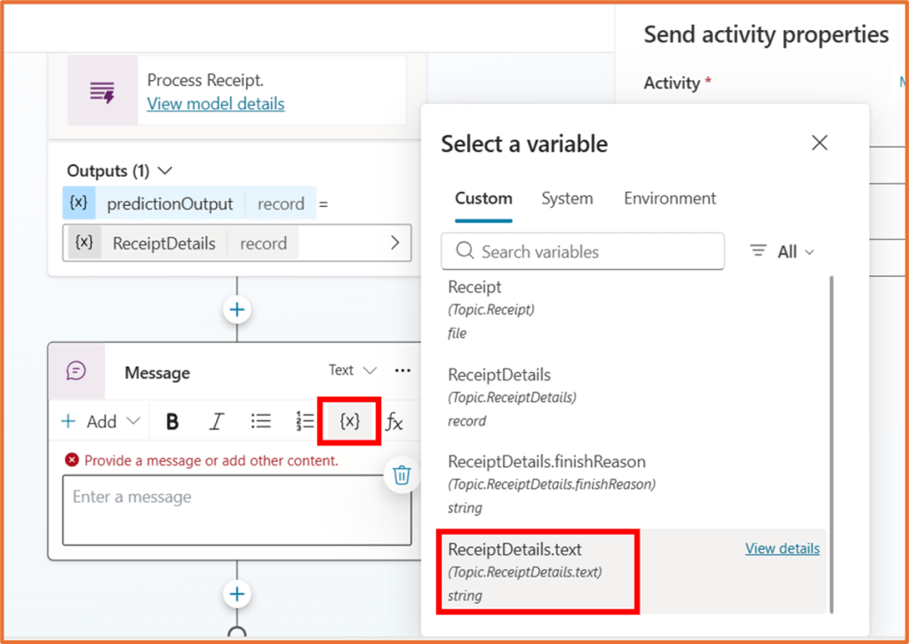 Finally, add a message node under the prompt step. Click on the {x} variable button in the message, and select the ReceiptDetails.text variable.