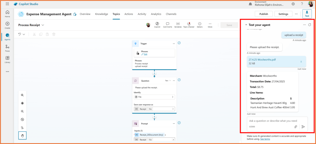 Microsoft Copilot Studio makes it easy integrate AI-powered document and image processing into your agents. By combining file upload capabilities with AI Builder’s AI Prompts, you can extract information in your desired format from documents like receipts. AI Prompts are natural language instructions that guide an AI model to perform a specific task—like extracting data from a document, summarising text, or generating a response—based on the context provided.