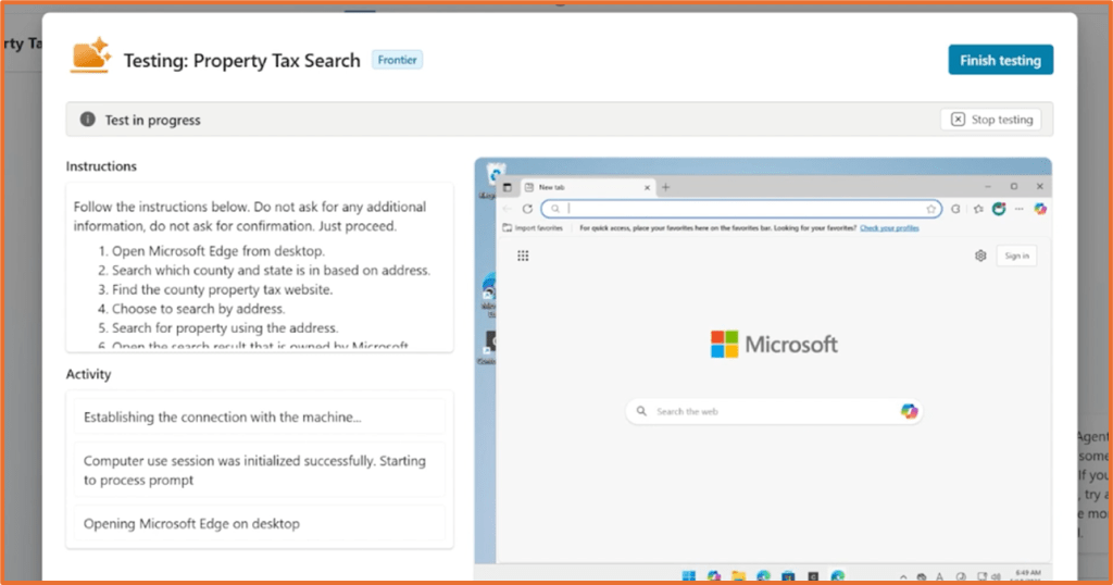 “Computer use” is currently available as a preview feature in Copilot Studio. Computer use allows agents to carry out tasks on websites and desktop apps in a way that mimics how a person would. It uses a virtual mouse and keyboard to click buttons, fill in forms, and move through screens, even when there’s no API available. The feature runs on Computer-Using Agents (CUA), which can adjust to layout changes and follow plain language instructions. You don’t need to write any code.
