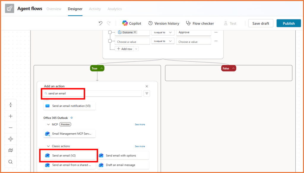 If True, let’s send an email confirming the approval. Click on + within the True branch and select the action Send an email (V2) from the Office 365 Outlook connector.