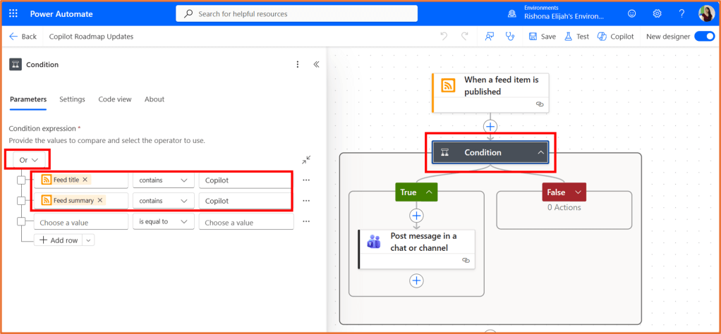 Your flow is now ready to go! You can save it, but you wont be able to test it until there is a feed item published on updated. The next time there is a Copilot feature updated or created at https://www.microsoft.com/en-au/microsoft-365/roadmap, you will receive the notification.